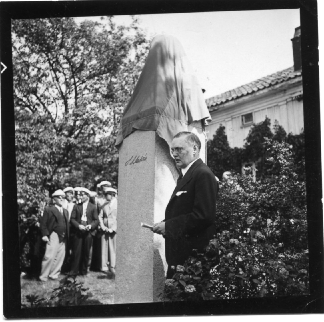 En man håller ett tal vid den täckta Andréebysten på slänten framför framför Grenna Hembygdsgård/Andréemuseum). Mannen är Felix Hamrin, landshövdning i Jönköpings län.