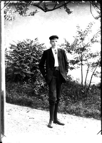 Porträtt av Erik Gyllensvaan. Han står utmed en husfasad, möjligen vid Bergsgatan 58 där fotografen har sin ateljé.