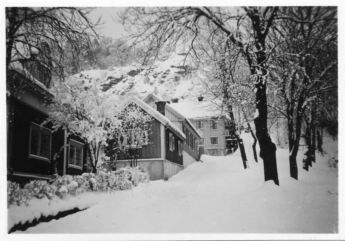 Bebyggelse i vinterskrud. Fastigheter till vänster och en park till höger.