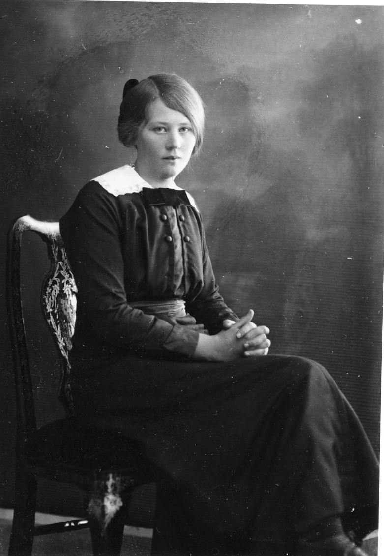 Porträtt av en flicka, Ester Johansson från Fallet. Hon sitter på en stol i 3/4-profil vänd mot fotografen med händerna knäppta i knät.