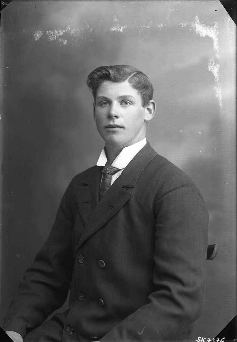Porträtt av en ung man, John Ekström från Åsa, Gränna socken. Han bär kostym, ljus skjorta och mörk slips.