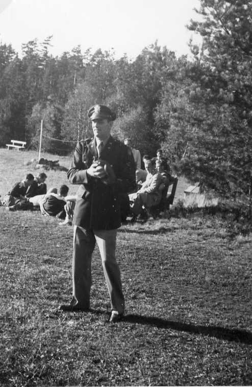 En man i amerikansk uniform som troligen spelar baseball. En grupp med män i bakgrunden. Möjligen på Åsavallen i Gränna.