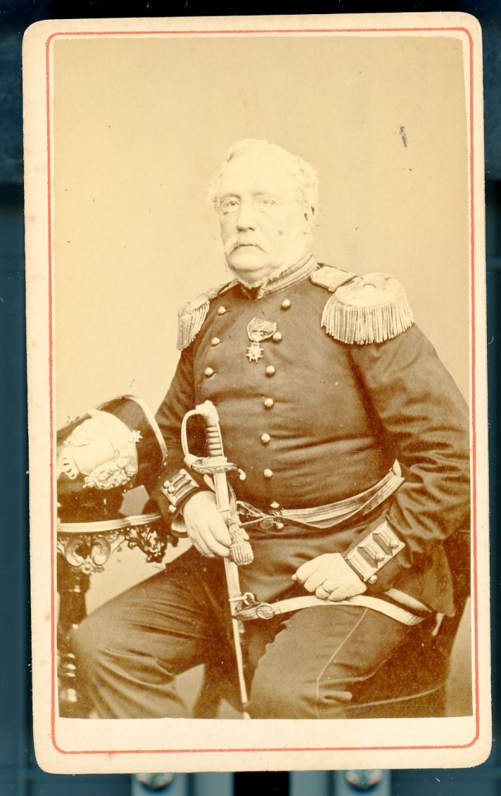 Kabinettsfotografi: Nils Fredrik Hjertström i militär uniform med värja sittande i en stol med högerarmen och kask vilande på ett bord.
