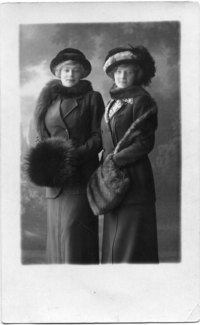 Två vinterklädda kvinnor med stora hattar och muff i en ateljé. Vykort