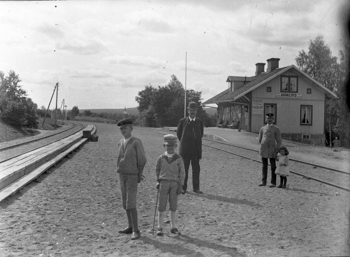 Två pojkar i sjömanskostym står framför en man med kubb och käpp framför Bankeryds järnvägsstation. Något bakom dem till höger står en annan man i uniform med en liten flicka i handen. Det är troligen stationsmästare Gustaf Hessel.