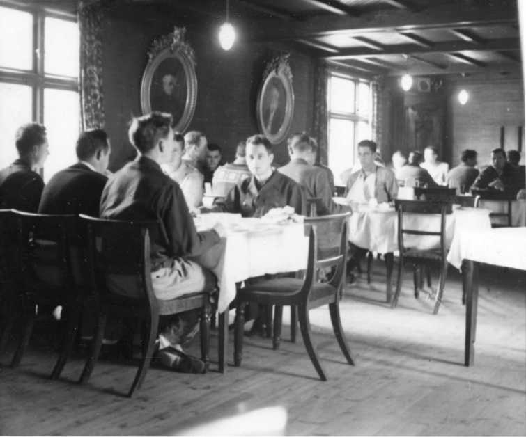 Män vid dukade bord på Ribbagården. Två porträttmålningar i ovala ramar mellan två fönster.