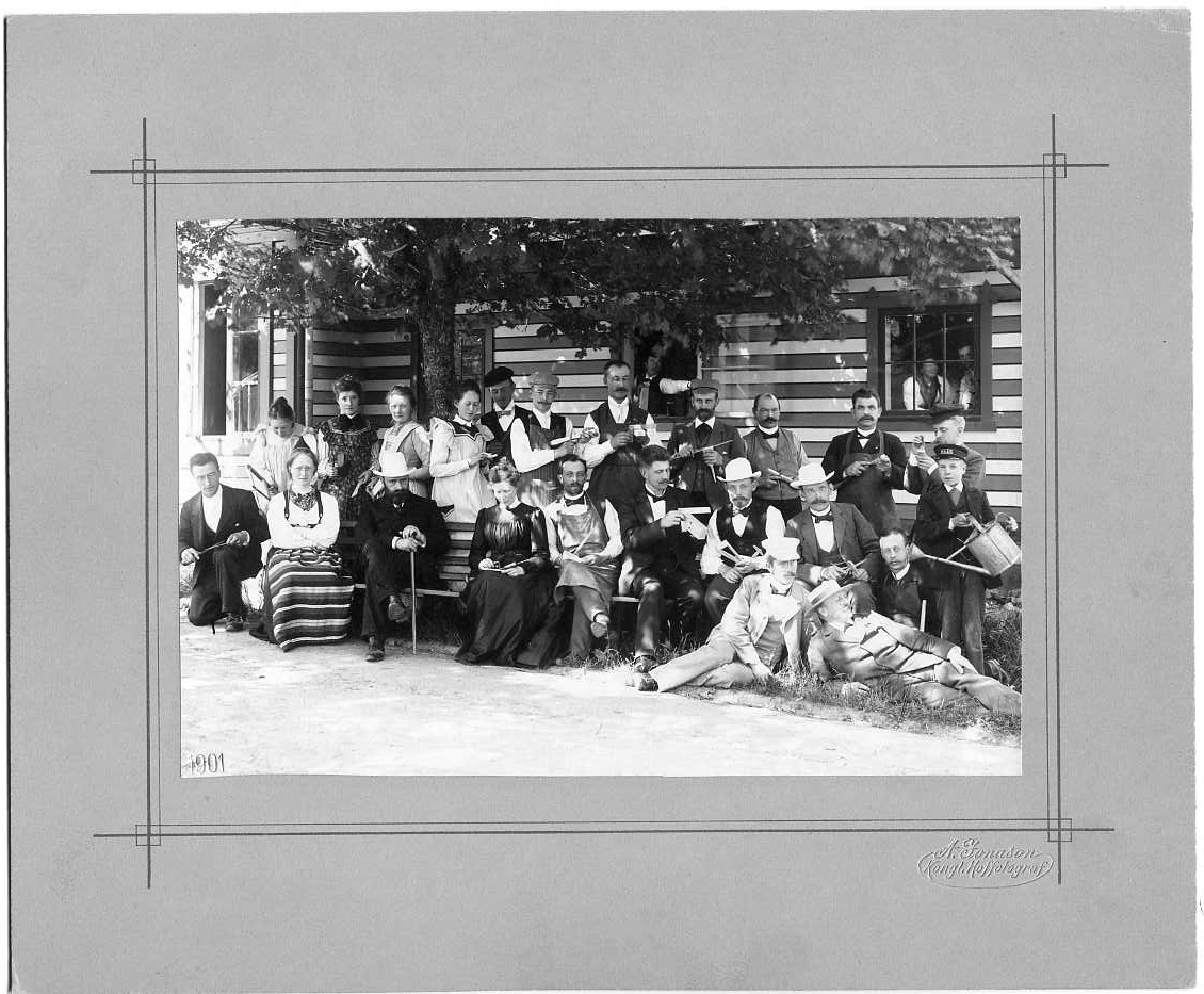 Manliga och kvinnliga kursdeltagare vid slöjdseminariet i Nääs, sittande och stående utanför huset Källnääs. En kvinna i folkdräkt. Stående som nr 3 fr v är Charlotta Kristina Johansson. Sittande som nr 3 fr v är Otto Salomon som startade slöjdseminariet i Nääs.