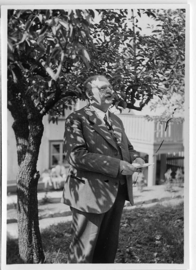 Fabrikör A E Bolling står på en gräsmatta i skuggan under ett träd och talar.