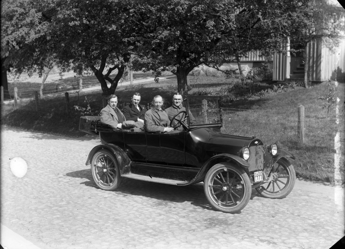 Tandläkare Krebs från Kinna med tre okända herrar i bil. Parkerade på Brahegatan utanför kv Hjorten 9 i Gränna.