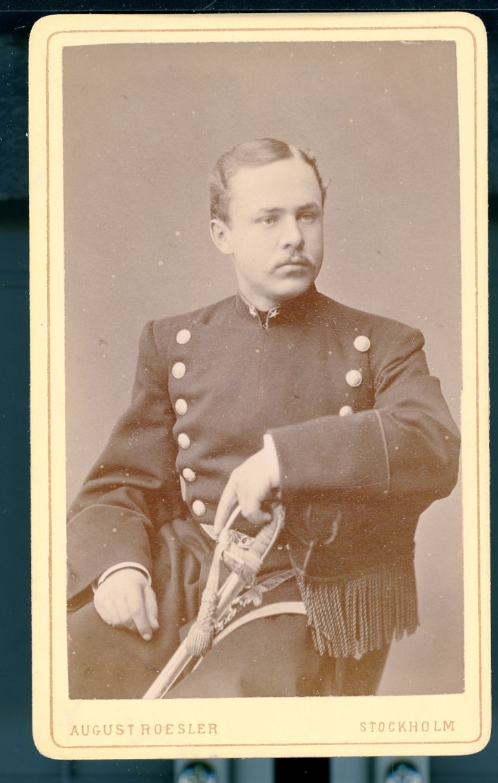 Kabinettsfotografi: Karl von Malmborg, sittande i uniform med handen på värjan.