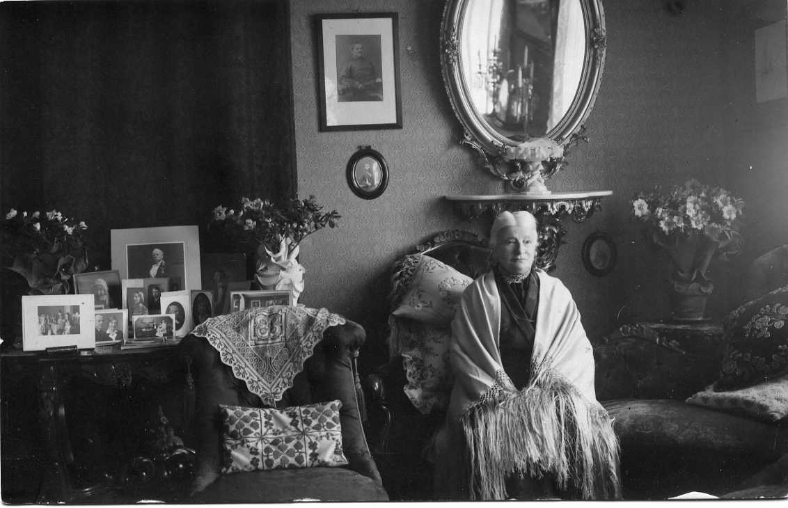 En äldre kvinna med en sjal över axlarna sitter in en fåtölj. På väggen bakom henne hänger en oval spegel med ornamenterad ram. På ett bord intill henne står bland annat ett fotografi med hennes framlidne man. Vykort
