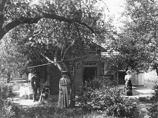 En lummig gårdssidan av Bergsgatan 4 i Gränna med familjen Allard. Till vänster sitter vagnmakaränkan Mathilda Allard intill sonen Gustaf. Vid ett träd står en yngre kvinna med hatt och rutig klänning med mörk plissering, troligen Hedvig (Mimmi) och till höger i solljus en annan ung kvinna med ljust livstycke och kjol, troligen Velis.