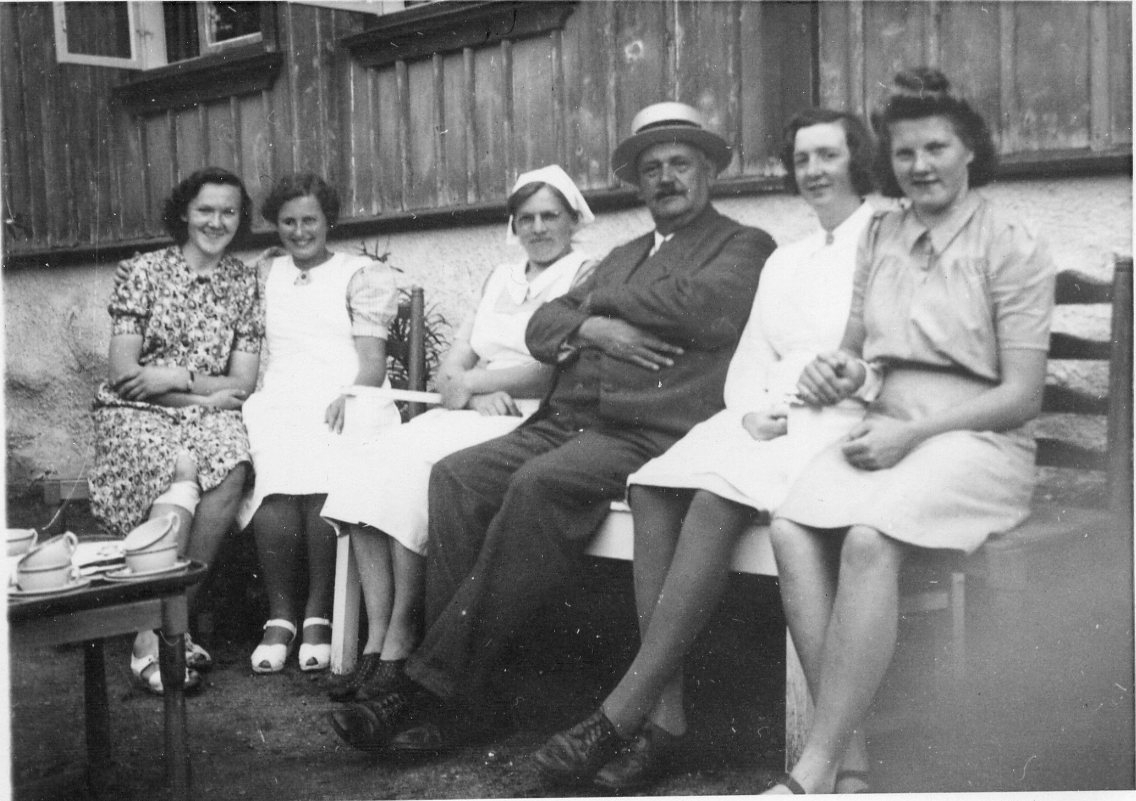 Fem kvinnor och en man sitter i en trädgård vid en husvägg. Framför dem ett bord med stapplade kaffekoppar.
