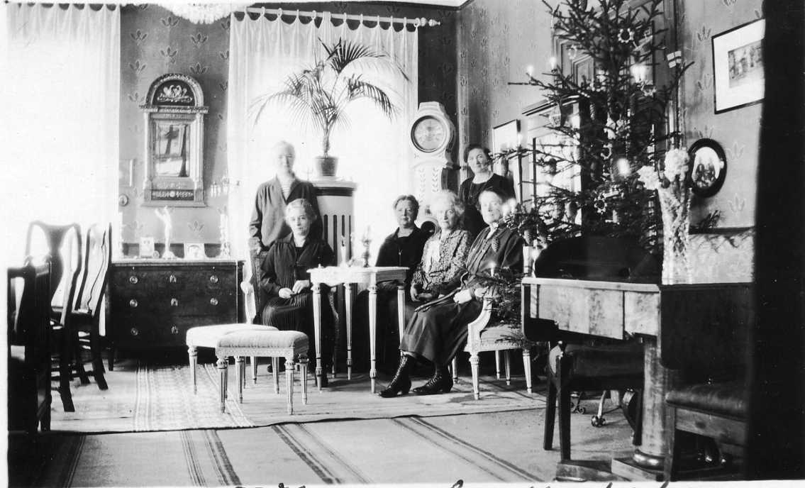En interiör med sex kvinnor vid jultid. Två kvinnor står bakom fyra sittande vid ett litet bord. En julgran till höger.