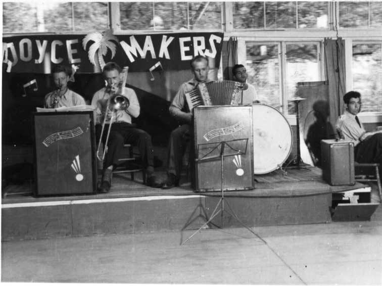 En orkester spelar på Ribbagården. Mannen med trombon är R G Fox.