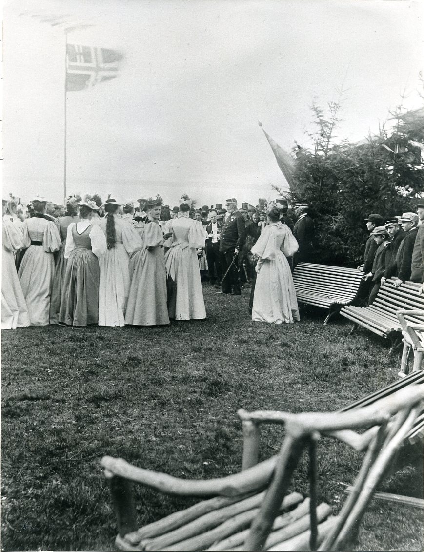 Kung Oscar II står på Grännaberget omgiven av Grännabor. Närmast i bild damer i långa ljusa klänningar och små hattar på huvudet. Till höger står ett gäng pojkar lutade mot parkbänkar. Unionsflaggan är hissad.