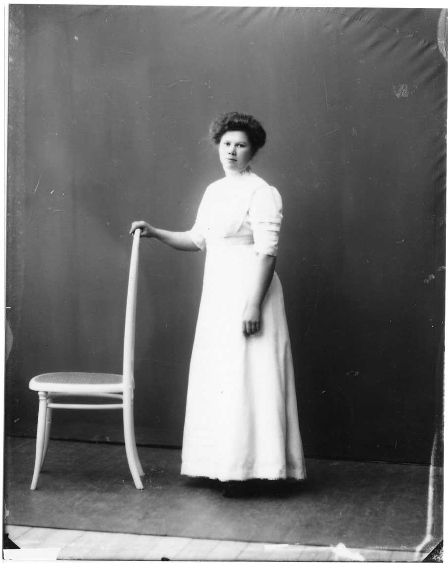 Porträtt av Rut Andersson från Örserum. Hon står i en fotsid ljus klänning med höger hand vilande på en stolsrygg.