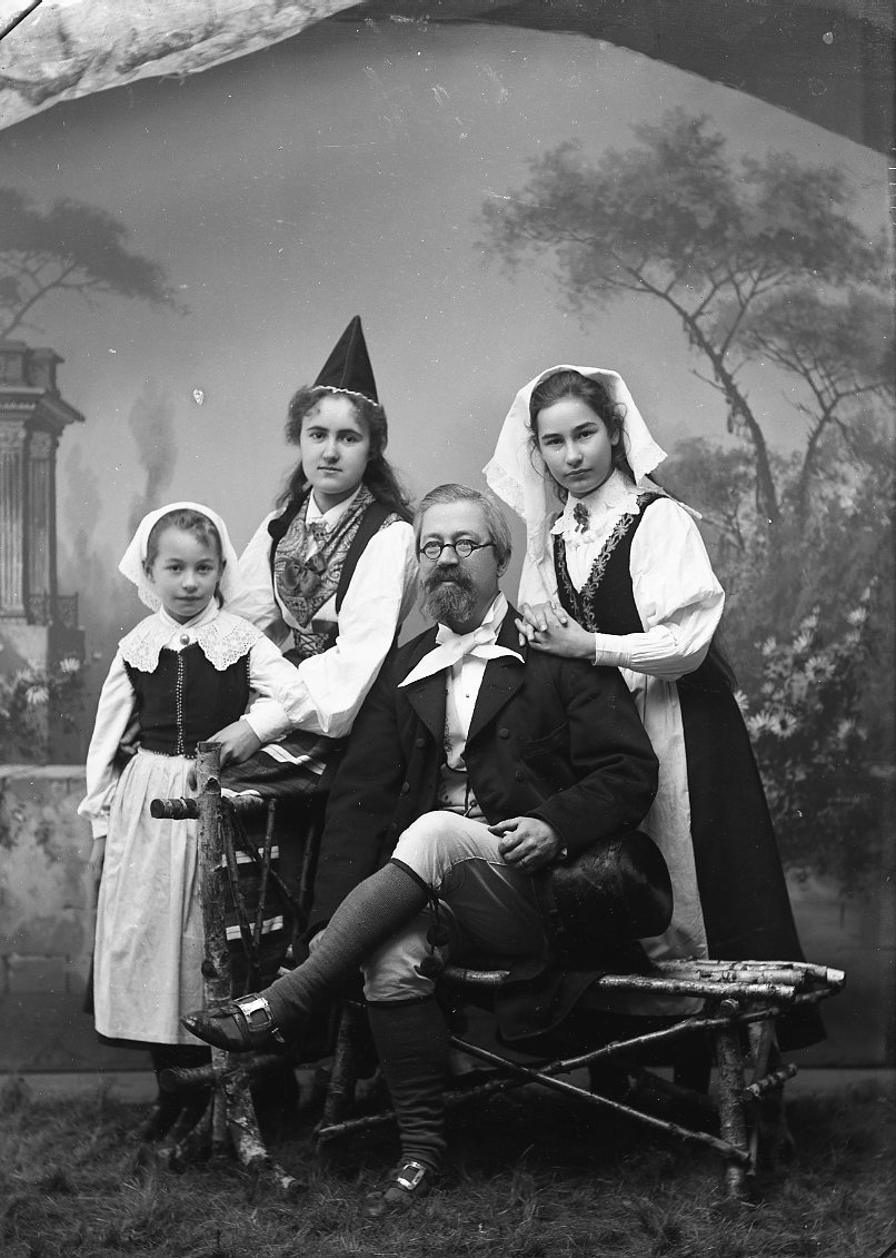 En flicka och två yngre kvinnor i folkdräkt står intill en man som sitter på en bänk av grenar. Han har glasögon, skägg och bär knäkorta byxor och skor med spänne samt en svart rock. En antik fond i ateljén. Mannen heter möjligen Johnson.
