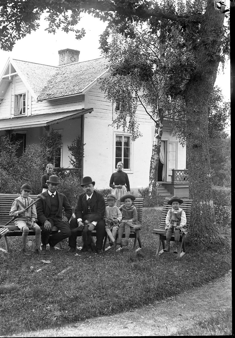 En grupp vuxna och barn, och en hund, sitter i trädgårdsmöbler framför ett tvåvåningshus med putsad nedre del. Andra våningen har liggande timmer.