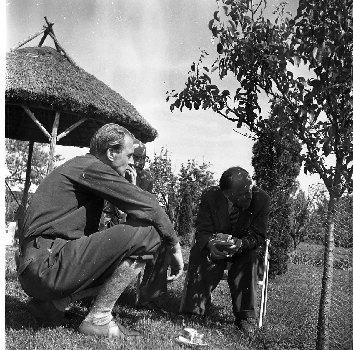 Tre män sitter och pratar och dricker kaffe. De sitter utomhus under ett ungt träd. Till vänster står ett parasol tillverkat i vass.
