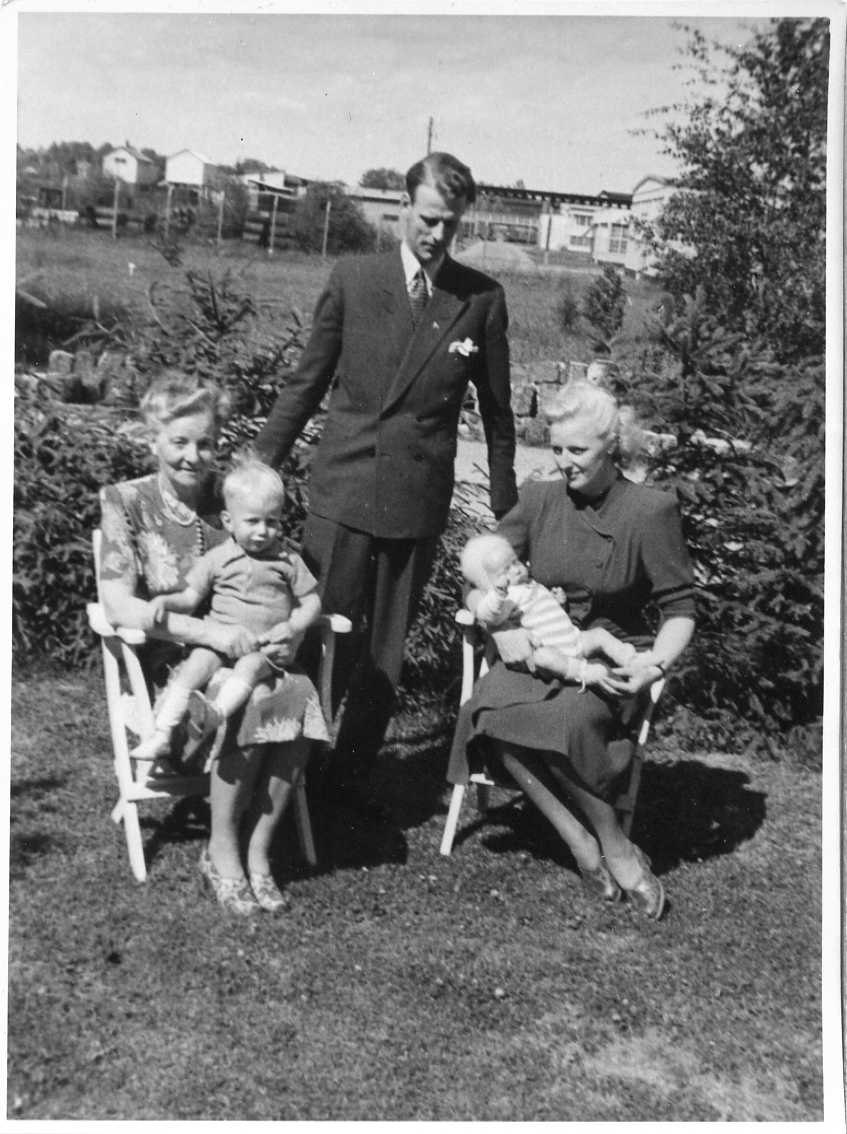 Två kvinnor sitter i trädgårdsstolar, båda har barn respektive spädbarn i knät. En kostymklädd man står mellan dem.