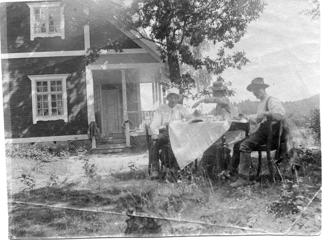 Tre män med hatt och arbetskläder sitter vid ett trägårdsbord framför ett hus. De har stövlar på fötterna.