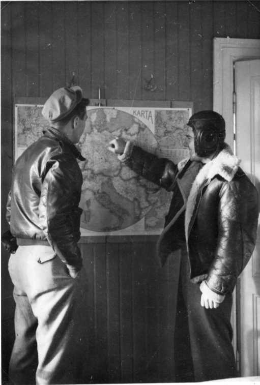 Två män i flygarkläder tittar och pekar på en väggkarta över Tyskland.