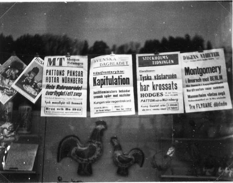 Skyltfönster med löpsedlar om "Pattons pansar hotar Nürnberg", "Västfrontsrykte: Kapitulation", "Tyska västarmén har krossats" samt "Montgomery i ilmarsch mot Elbe", från tidningarna Morgon-Tidningen, Svenska Dagbladet, Stockholms-Tidningen och Dagens Nyheter.