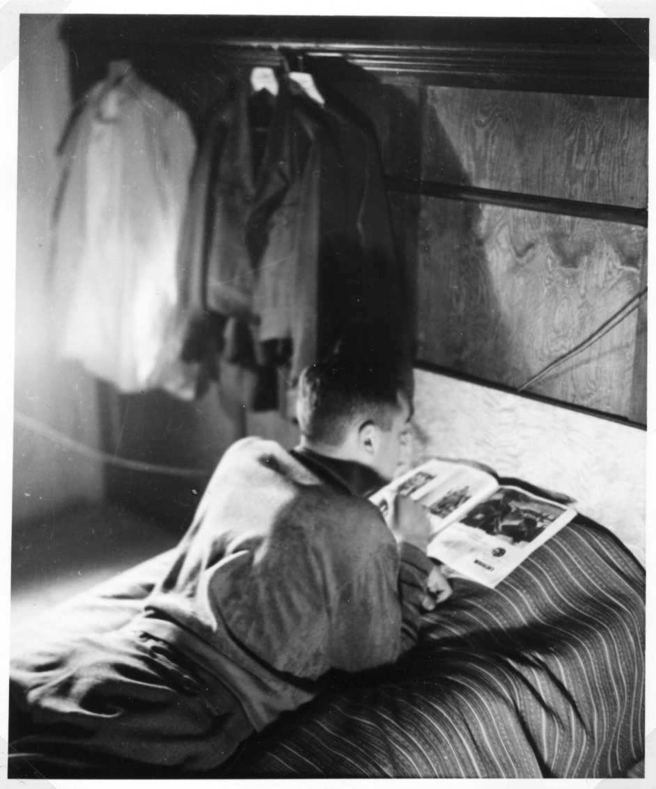 En ung man ligger på en säng med randigt överkast och läser i en tidning. På väggen hänger skjortor och uniformsjackor.