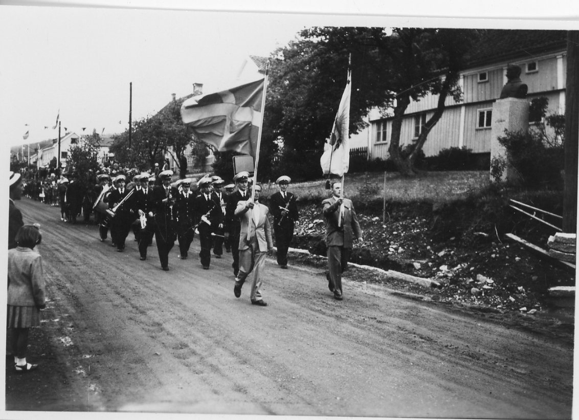 Två manliga fanbärare går i täten med en musikkår efter sig på Brahegatan i Gränna.