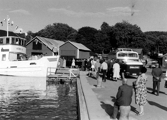 Färjan Hebe V ligger vid kaj i Gränna hamn. Folk lämnar och andra väntar på att gå ombord. En buss med glastak och liten släpvagn från "Nyman & Schultz" står parkerad till vänster. Enstaka bilar. Det är vacker väder, det glittrar i hamnbassängen.