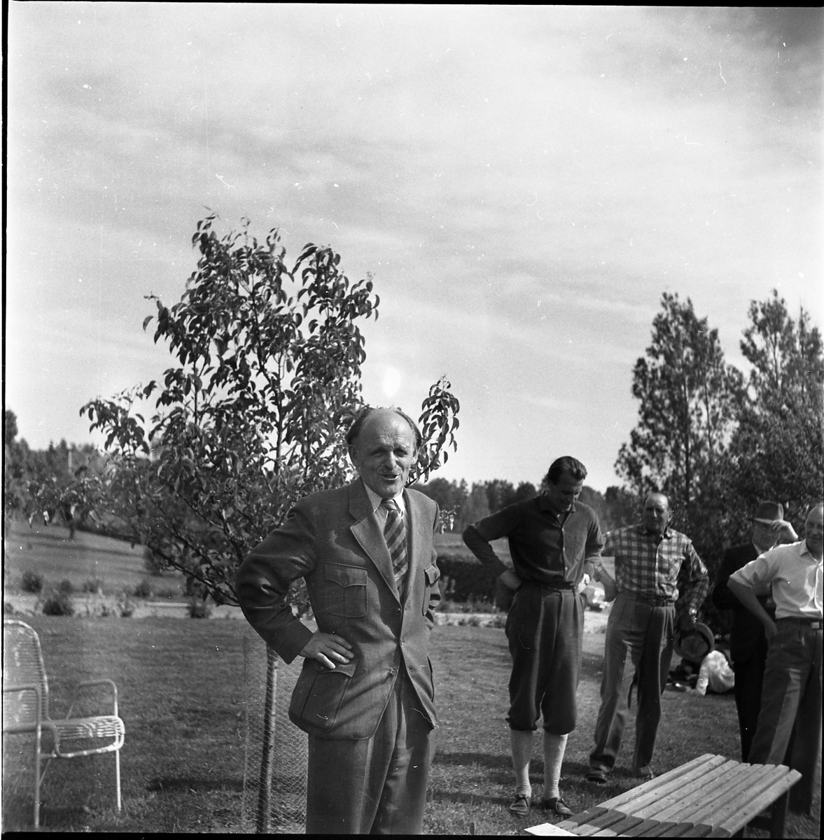 En man står med armarna i sidorna och ser väldigt glad ut. Bakom honom har han ett ungt träd inhägnat i hönsnät. Lite snett bakom honom står fyra män till, även de med händerna i sidorna.