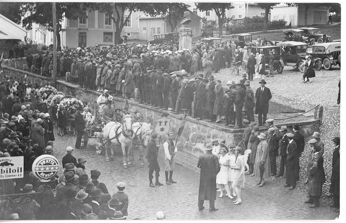 Barn med blomsterbågar står på led på Brahegatan i Gränna bakom en flakvagn dragen av två vita hästar. En stor folksamling står på torget vända mot kortegen. Även folk på Brahegatan. Bilar står parkerade på torget.