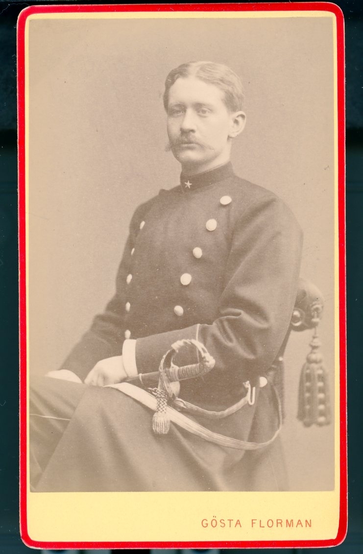 Kabinettsfotografi: Gösta von Rosen i uniform, sittande i stol med värjan i knät.