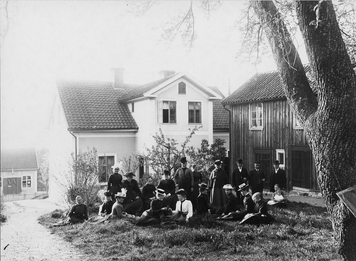En större grupp med män, kvinnor och enstaka barn, står och sitter på gräsplan på gården till Brahegatan 40. En putsad byggnad med ett öppet fönster och öppen dörr. Till höger en uthusbyggnad i två våningar med locklistpanel, möjligen rödfärgad.