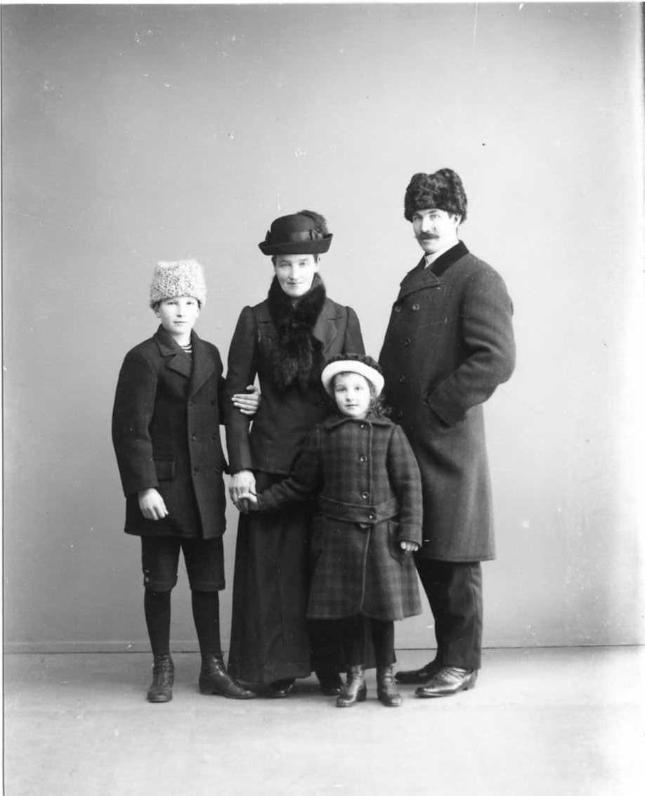 Gruppbild med familjen Karlsson, vinterklädda med huvudbonader i ateljén. Hugo Karlsson håller vänster hand om mamman Anna Karlssons högra arm. Hon håller i samma hand dottern Gretas hand. Till höger står pappan Oskar Karlsson.