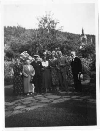 Ett sällskap kvinnor och män står i en trädgården, i bakgrunden sticker Gränna kyrkas torn upp bakom trädtoppar.