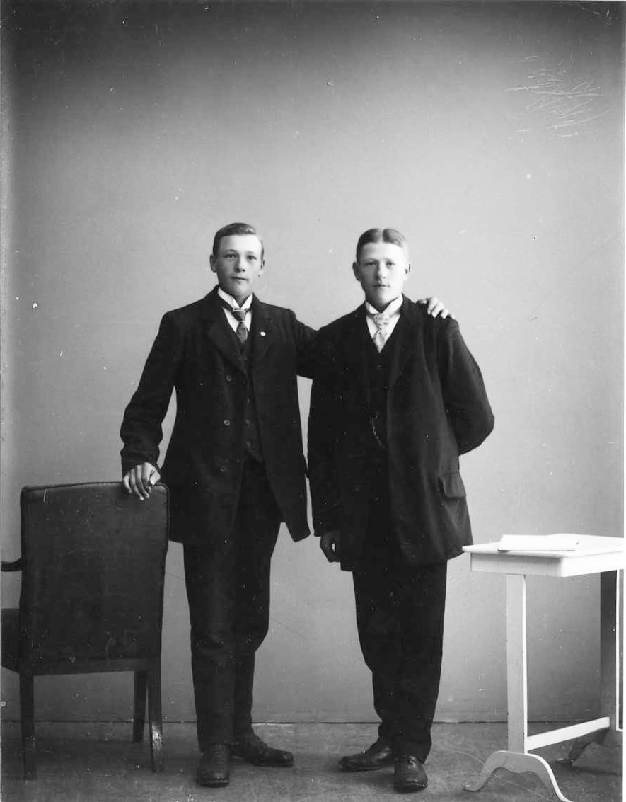 Gruppbild med två finklädda unga män. Den oidentifierade mannen till vänster håller vänster arm över axeln på Anton Lundkvist.