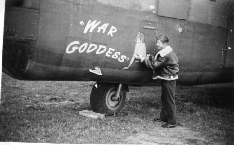 En man i kraftig skinnjacka med pälsfoder står vid nosen av det amerikanska bombplanet "War Goddess" och klappar på dess målning, en nästan naken kvinna.