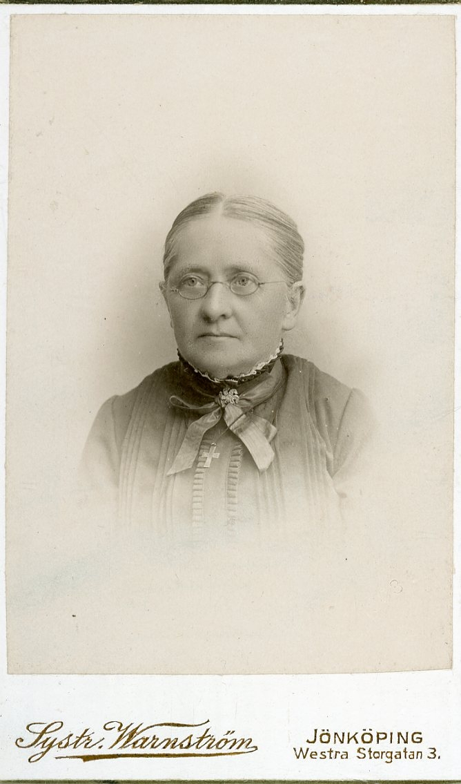 Porträtt av en okänd kvinna med glasögon och halsband med kors.