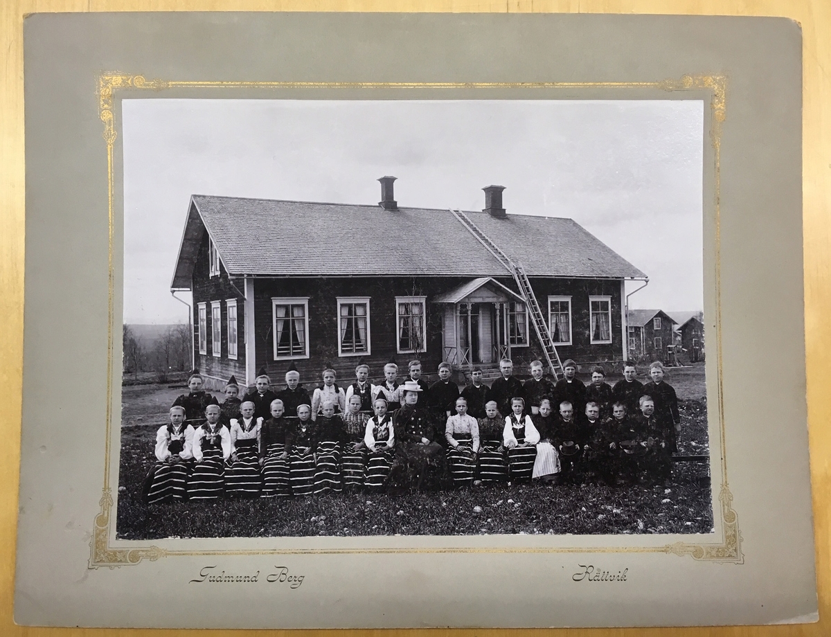 Folkskolelärarinnan Charlotta Kristina Johansson med skolbarn, delvis i folkdräkt, sittande framför skolhuset. Troligen vid Röjeråsen i Rättvik.