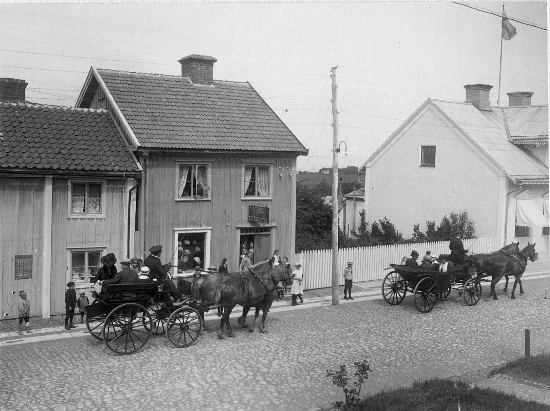 Två öppna hästdragna vagnar rullar norrut på Brahegatan i Gränna. Det är prinsparet Carl och Ingeborg med barn och följe som gör ett besök. Några barn står vid vägkanten utanför "P A Orres eftr. Hatt & Mössaffär" och tittar på följet.