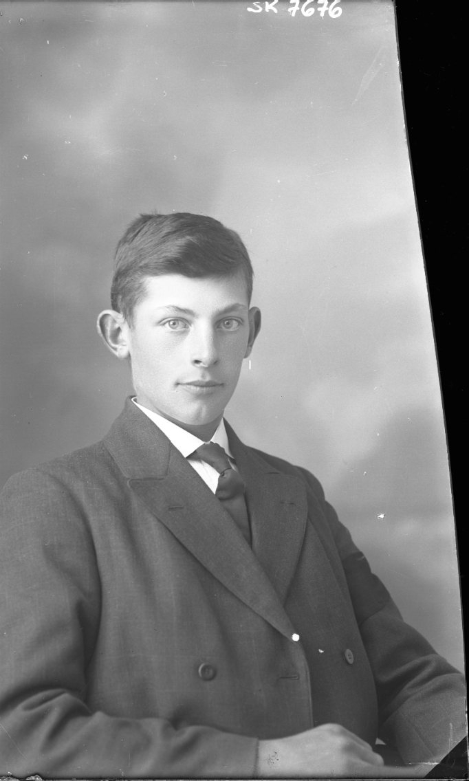Porträtt av en pojke som sitter med armarna i kors i en fåtölj.