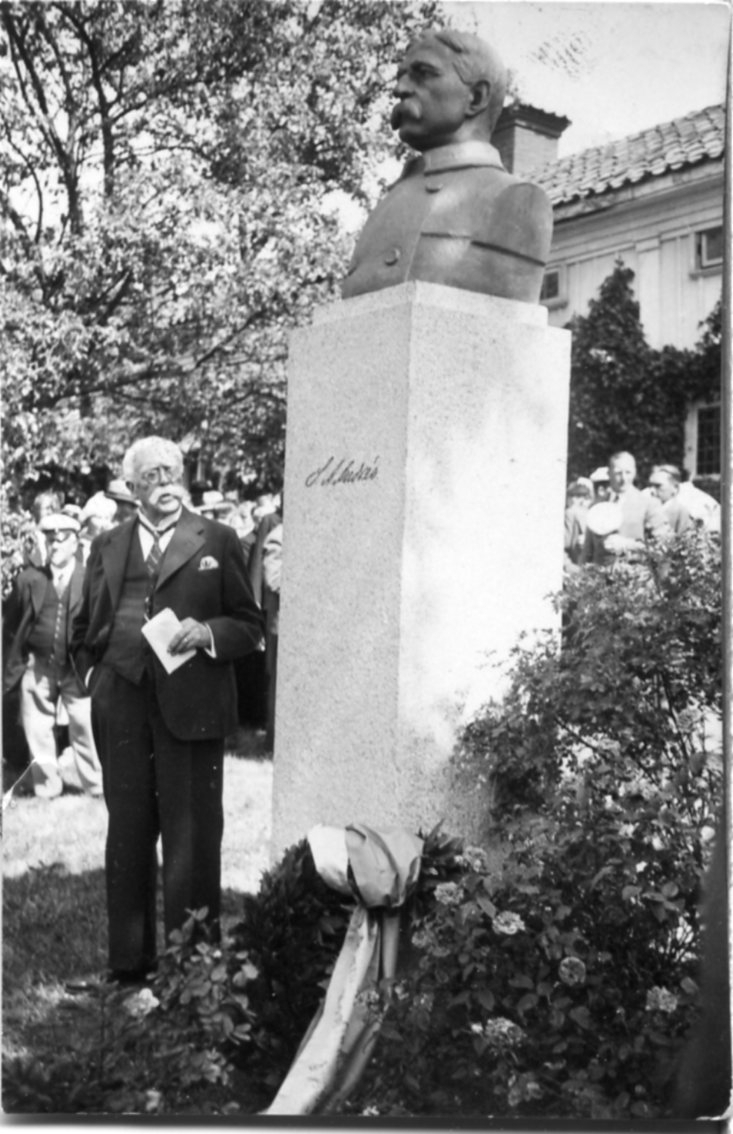 En man håller ett tal intill den Andréebyst som just har avtäckts och invigts på slänten framför framför Grenna Hembygdsgård/Andréemuseum). Mannen är Carl Setterberg, representant för Svenska Uppfinnarföreningen och bekant med S A Andrée.