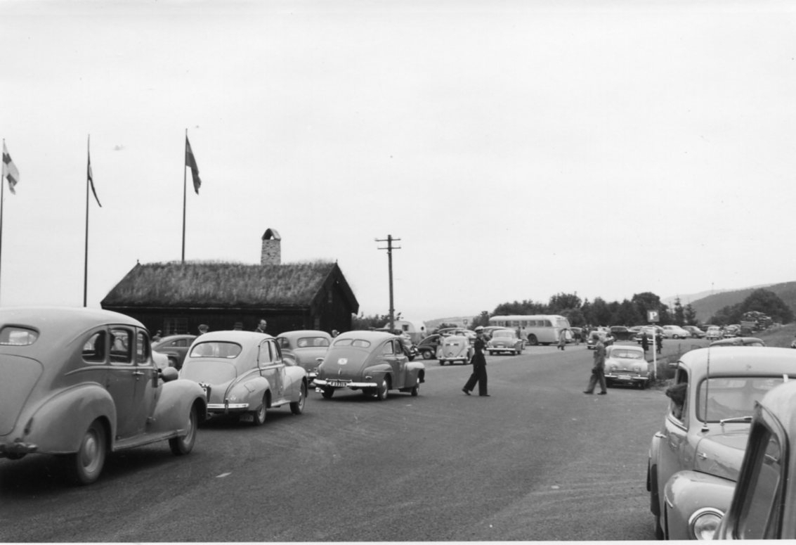 Ett stort antal bilar, en buss och en husvagn står parkerade vid Gyllene Uttern i samband med en solförmörkelse. En polis står mitt i vägen och dirigerar trafiken; en timmerbil på väg i riktning mot fotografen.