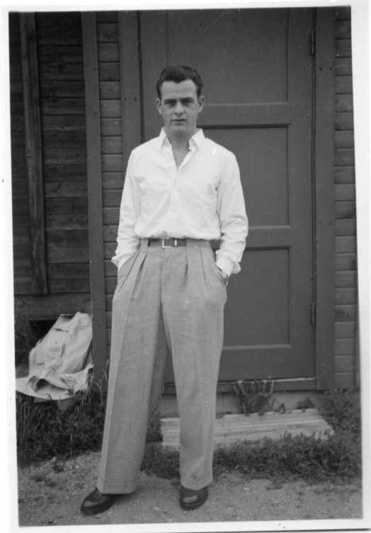 En ung man i vit skjorta och ljusa byxor framför okänd byggnad, han heter möjligen Michael Marchese.