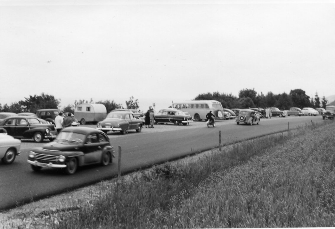 Ett stort antal bilar, en buss och en husvagn står parkerade strax norr om Gyllene Uttern i samband med en solförmörkelse.