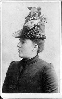 Porträtt av en kvinna. Hon bär en hög hatt med en fågel i.
