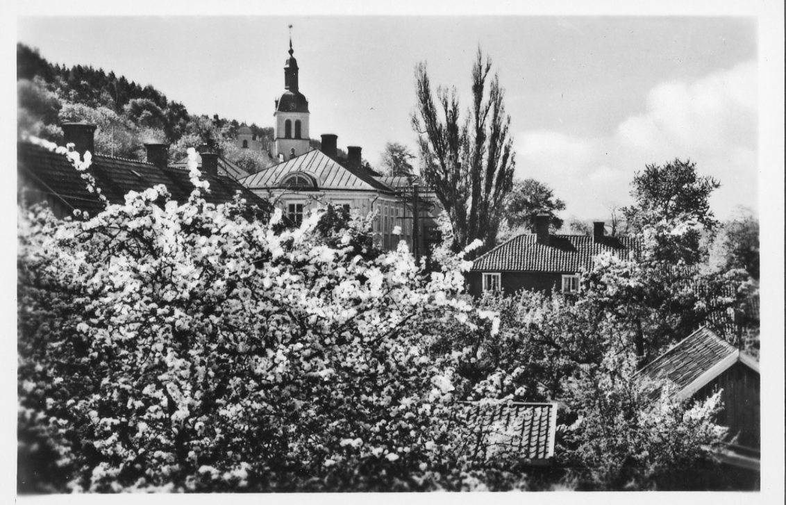 Fotografi av ett lummigt Gränna mot kyrkan i fonden. Bilden sannolikt tagen från balkongen mot väster på Brahegatan 39.