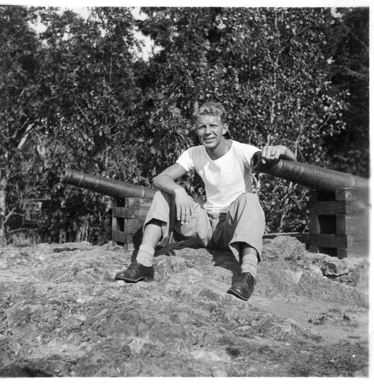 En ung man i t-shirt, troligen L T Sanford, sitter mellan salutkanonerna på Grännaberget.